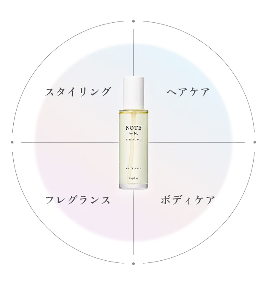 「NOTE by N.」最初の魅力は、「マルチユースオイル」であること。ヘアだけでなく、その“香り”と“潤い”を全身で堪能することができます。