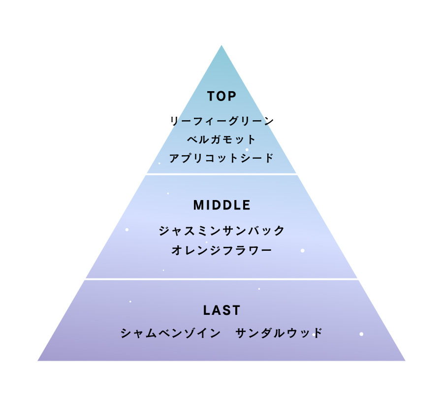 爽やかなシトラスの第一印象から、主役であるジャスミンとオレンジフラワーが花開き、気品の中に華やかさが漂う香りへと変化。そして温かみのあるサンダルウッドが心地よい余韻を残します。